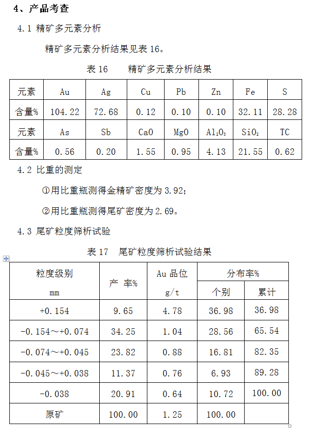 精礦和尾礦分析結果表。