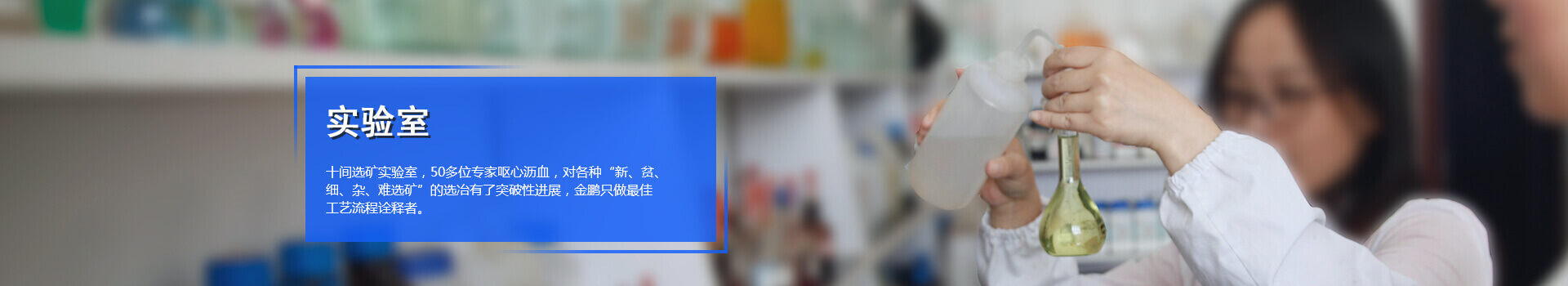 為了更好的進行選礦試驗研究工作,金鵬集團斥資打造了十一大先進的實驗室, 50多位選礦研究專家,先后承擔了上千個礦山項目實驗工作,經驗豐富。實驗室 配備了完善的選礦實驗研究設備和巖礦鑒定設備。能夠進行各種有色金屬,黑色金屬 及非金屬復雜難選冶礦石的實驗研究工作。其中黃金、白銀、銅礦、鉛鋅礦、鎢鉬銻礦 、鈦鐵礦、錳礦、磁褐鐵礦、赤鐵礦選礦技術,鉀鈉長石、石英、螢石、石墨等非金屬 提純、各種氧化礦的回收、綜合利用等多項研究成果已處于國際國內領先水平。