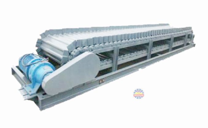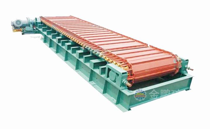 采用節(jié)距為150mm的高強(qiáng)度模鍛鏈條為牽引件,兩根鏈條繞過安裝在機(jī)體頭部的一對驅(qū)動鏈輪和機(jī)體尾部的一對張緊輪聯(lián)成封閉形回路,在兩排鏈條的每個鏈節(jié)上裝配了相互交迭的、輕型結(jié)構(gòu)的輸送槽而成為一個連續(xù)的能夠運(yùn)載物料的輸送線路。其自重和物料的重量由安裝在機(jī)體上的多排支重輪、鏈托輪和滑道梁支承。傳動系統(tǒng)經(jīng)交流變頻調(diào)速電動機(jī)聯(lián)接減速機(jī),再由漲套與驅(qū)動裝置直聯(lián)驅(qū)動運(yùn)載機(jī)構(gòu)低速運(yùn)行。將尾部料倉卸入的物料沿輸送線路運(yùn)至機(jī)體的前方排出,實(shí)現(xiàn)向下方的工作機(jī)械連續(xù)均勻喂料的目的。